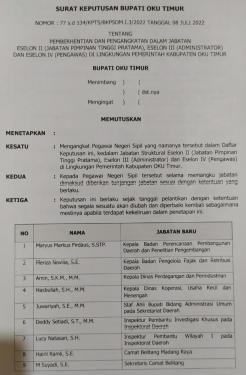OKU TIMUR, IDSUMSEL.COM – Pemerintah Kabupaten OKU Timur kembali merotasi sejumlah pejabat eselon II, III dan IV dìlingkungan Pemkab OKU Timur, Senin (11/7/2022) sore sekitar pukul 17.00 WIB.