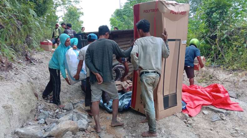 Akibat Jalan Rusak, Mobil Pick Up Bawa Sembako Menuju Villa Masin Terbalik