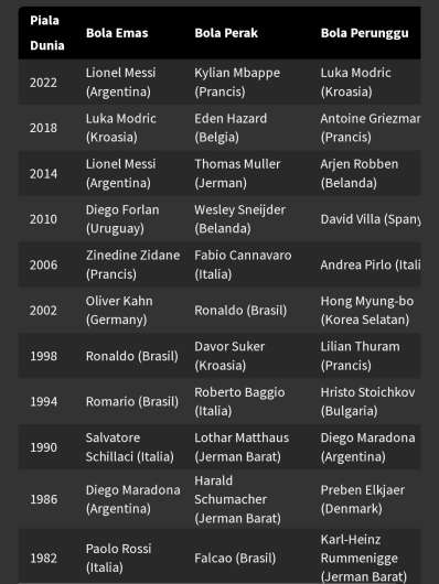 Anda bisa melihat daftar lengkap pemenang Bola Emas Piala Dunia dì atas, yang juga termasuk peraih Bola Perak dan Bola Perunggu.