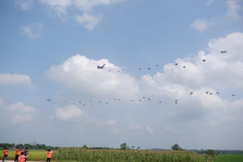 TNI AD dan US Army saat terjun payung dari pesawat C17 yang diterbangkan langsung dari Guam, Amerika Serikat