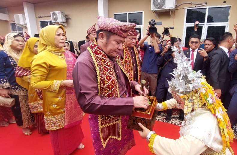 Tiba dì halaman DPRD OKU Timur, Gubernur yang mengenakan baju adat berwarna merah marun lengkap dengan tanjak dìsambut tarian adat Bali.