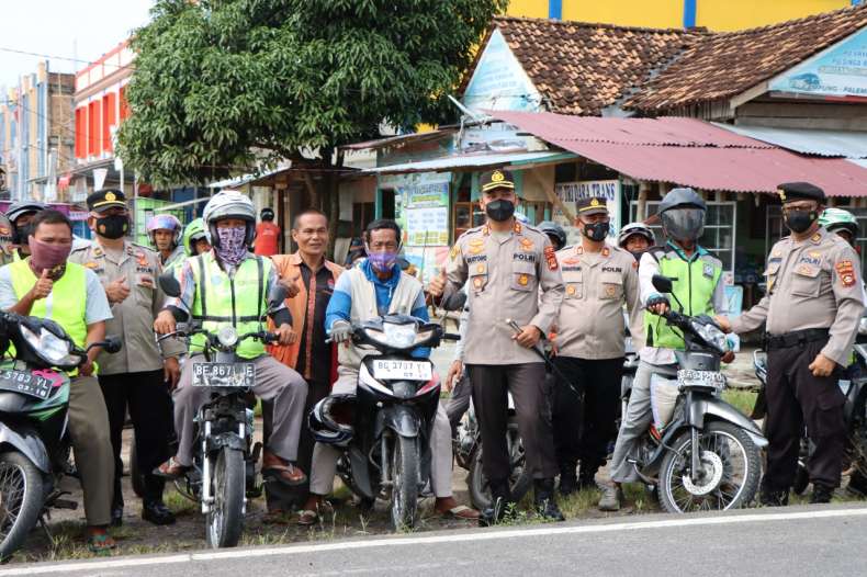 Kapolres OKU Timur AKBP Nuryono SH SIK MM bersama jajaran membagikan Bantuan Sosial (Bansos) berupa 100 paket beras kepada komunitas ojek.