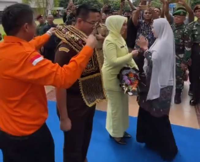 Penyambutan Kajari dan Ketua Ikatan Adhyaksa Dharmakarini diawali dengan pemasangan slendang dan pemberian buket bunga.