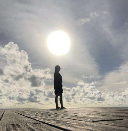 Aura berpose di bawah terik matahari. Backlight membuat potretnya menjadi siluet. Namun tak menghilangkan aura kecantikan yang dìmilikinya. Tubuh indah Aura juga tampak seksi terpantul cahaya tersebut.