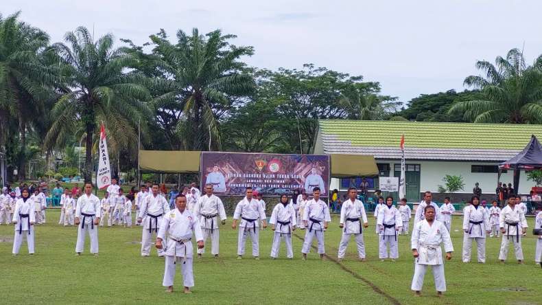 OKU TIMUR, IDSUMSEL.COM – Pengurus Kabupaten (Pengkab) Lembaga Karate do Indonesia (Lemkari) OKU Timur melaksanakan Gashuku atau latihan bersama ujian tukar sabuk dì lapangan Batalyon Armed 15/105 Tarik Cailendra, Minggu (6/11/2022).